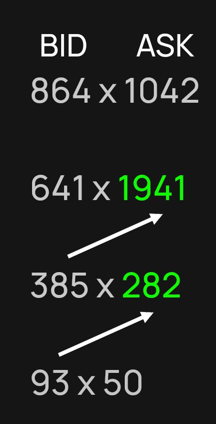 Like a book, you read the footprint left to right, but unlike reading a book, you read up and to the right to look for imbalances. In this case, I'm looking for times where the ask volume is at least 300 percent higher than the bid volume and highlighting the text green when this happens - a buying imbalance. If the opposite is true, it is highlighted red for a selling imbalance.