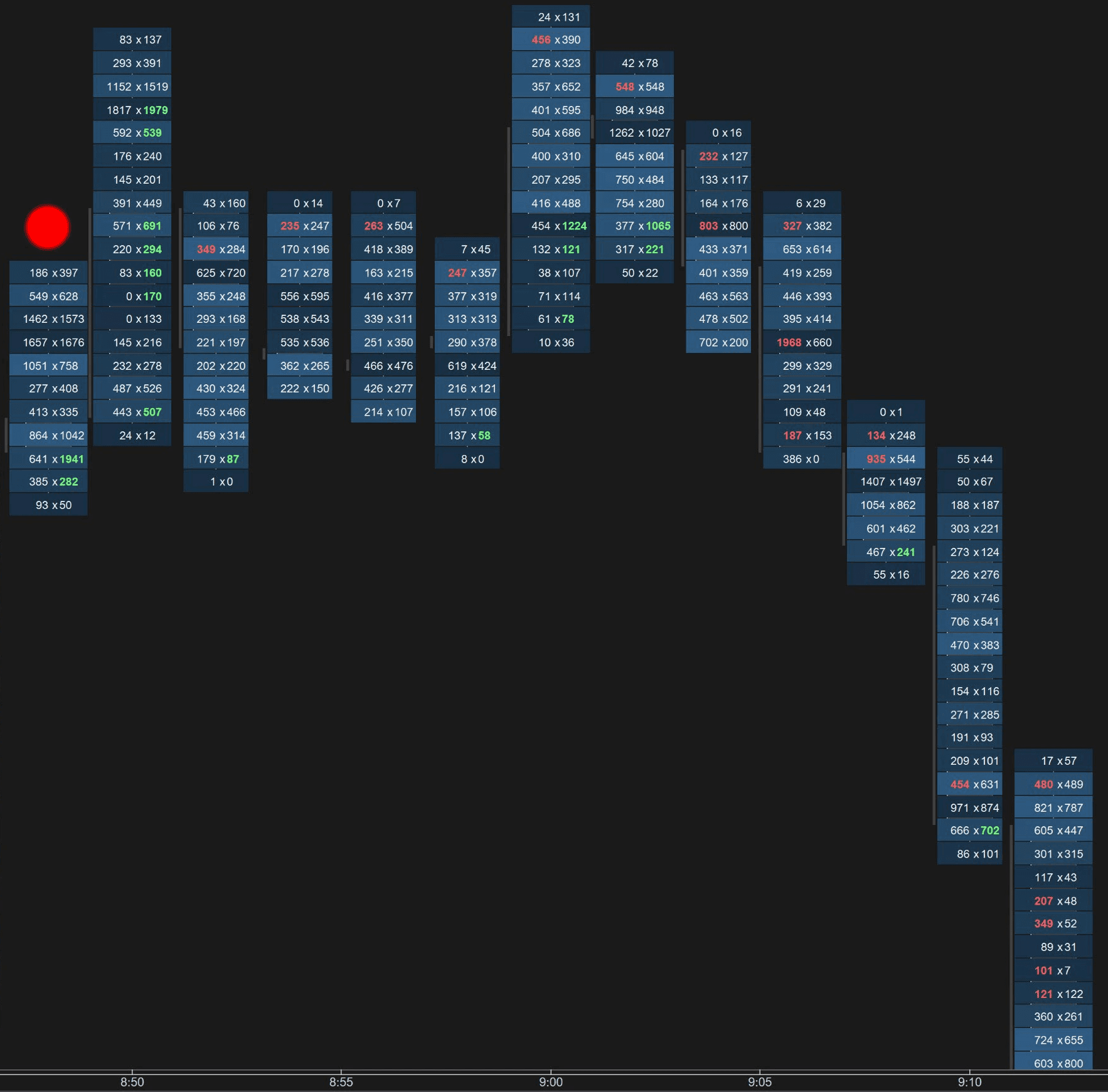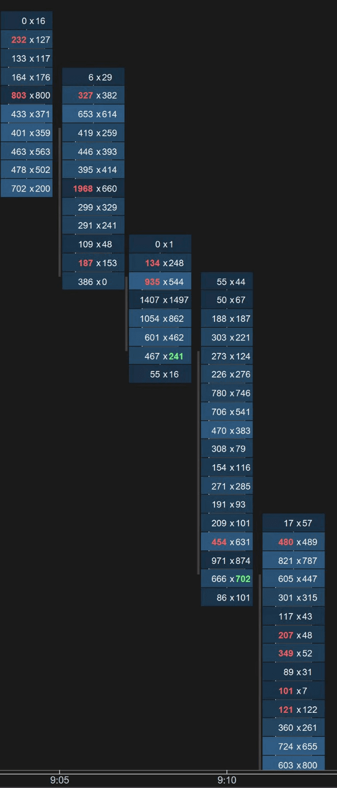Right before 09:05, there are two candles in a row with at least two sell imbalances and notice how low the volume is at the tops now (there's even some 0s), buyers are having a hard time selling at higher prices. 5 minutes later, we get a huge liquidation to the downside as panicked buyers who bought the highs look for an exit.