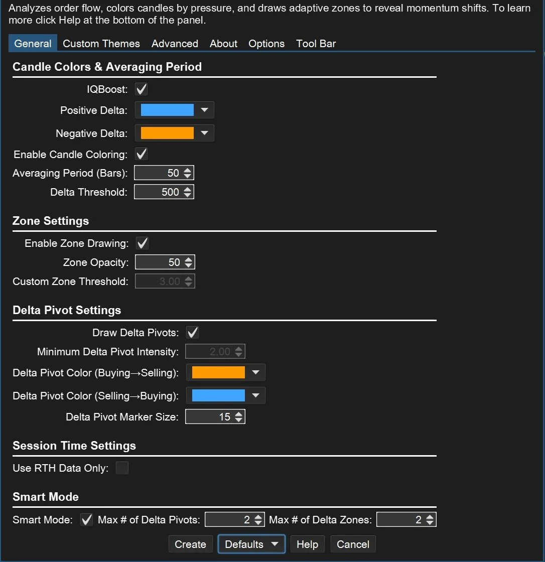 In Smart Mode, Delta Zones and Delta Pivots are added and removed automatically based on their intensity values. This mode is for traders who prefer tweaking less settings and having a less cluttered chart. If a Delta Zone or Delta Pivot disappears during a trading session when Smart Mode is enabled it is because a newer zone or pivot is stronger than a previous one. Smart Mode is useful in high-frequency environments where too many signals may obscure meaningful activity.